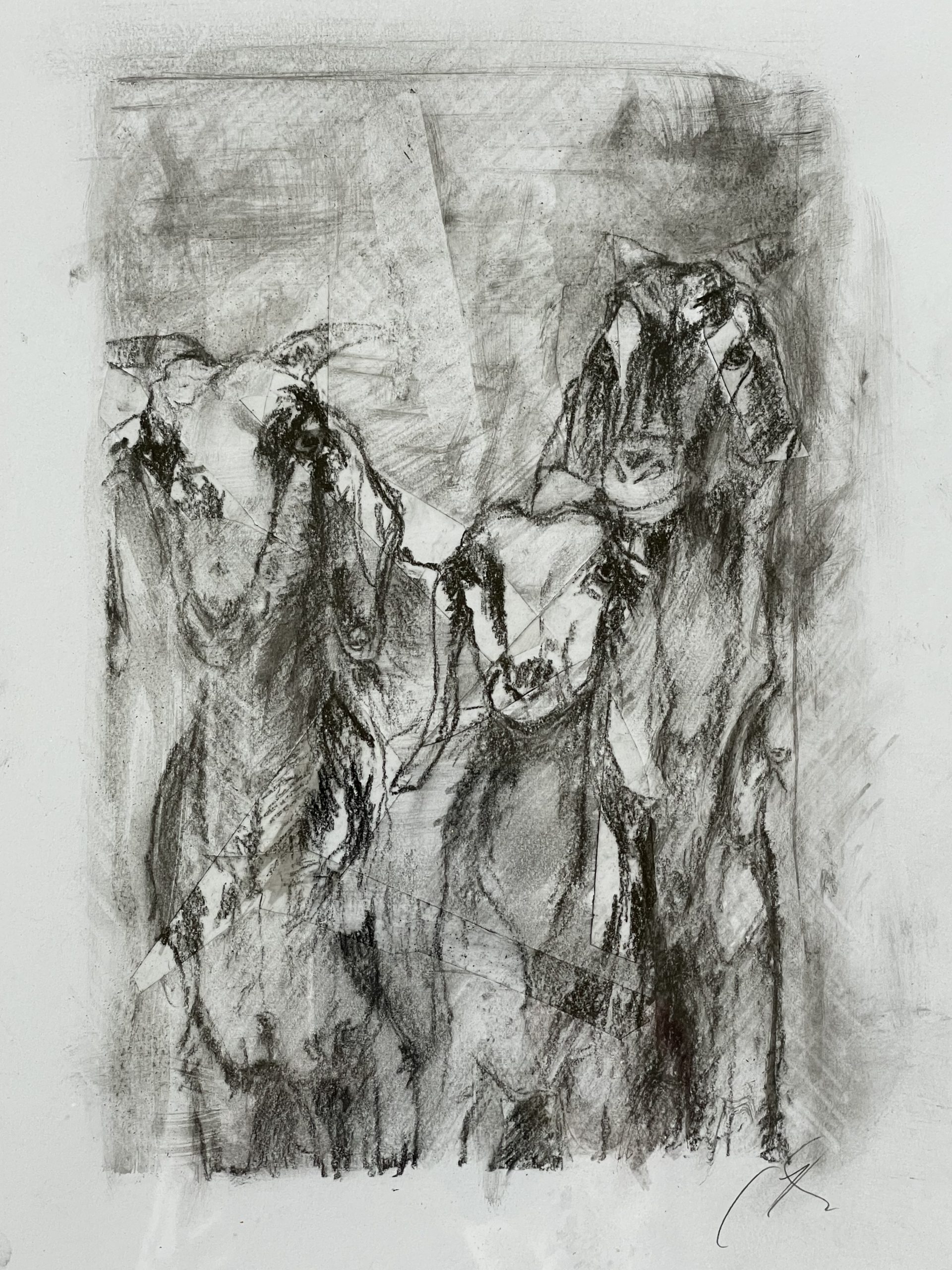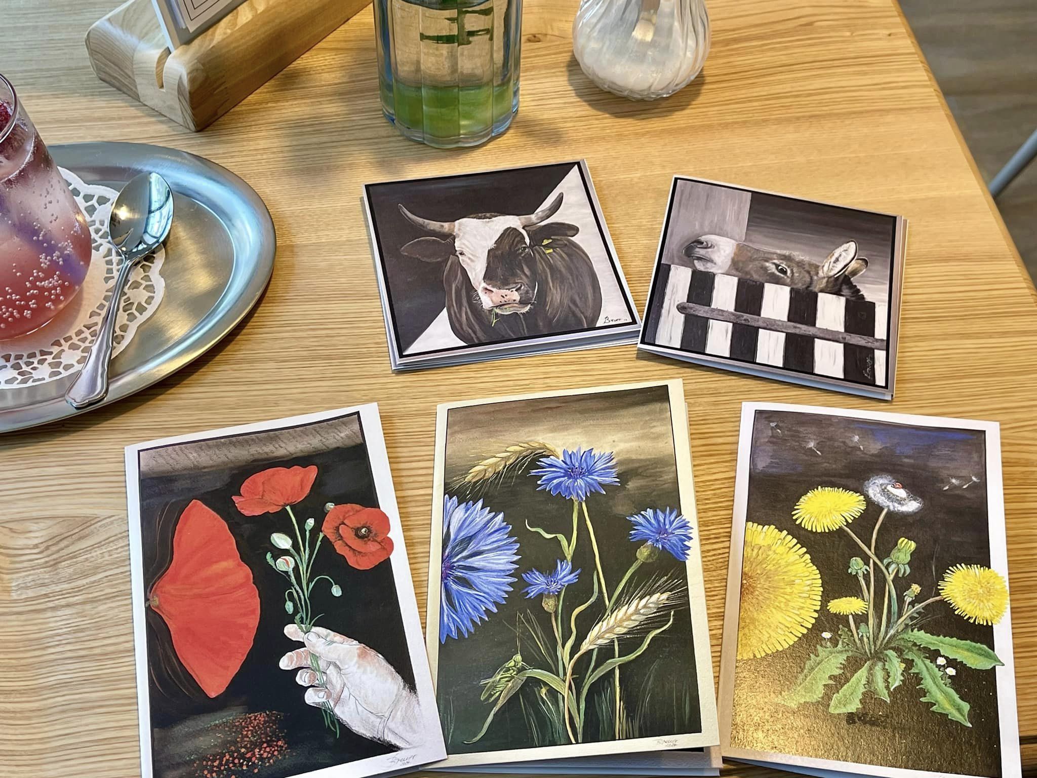 Zwei große Tierportraits in Schwarz / Weiß und 2 Sommer-Schnappschüsse, die in Gouache wiedergegeben wurden.